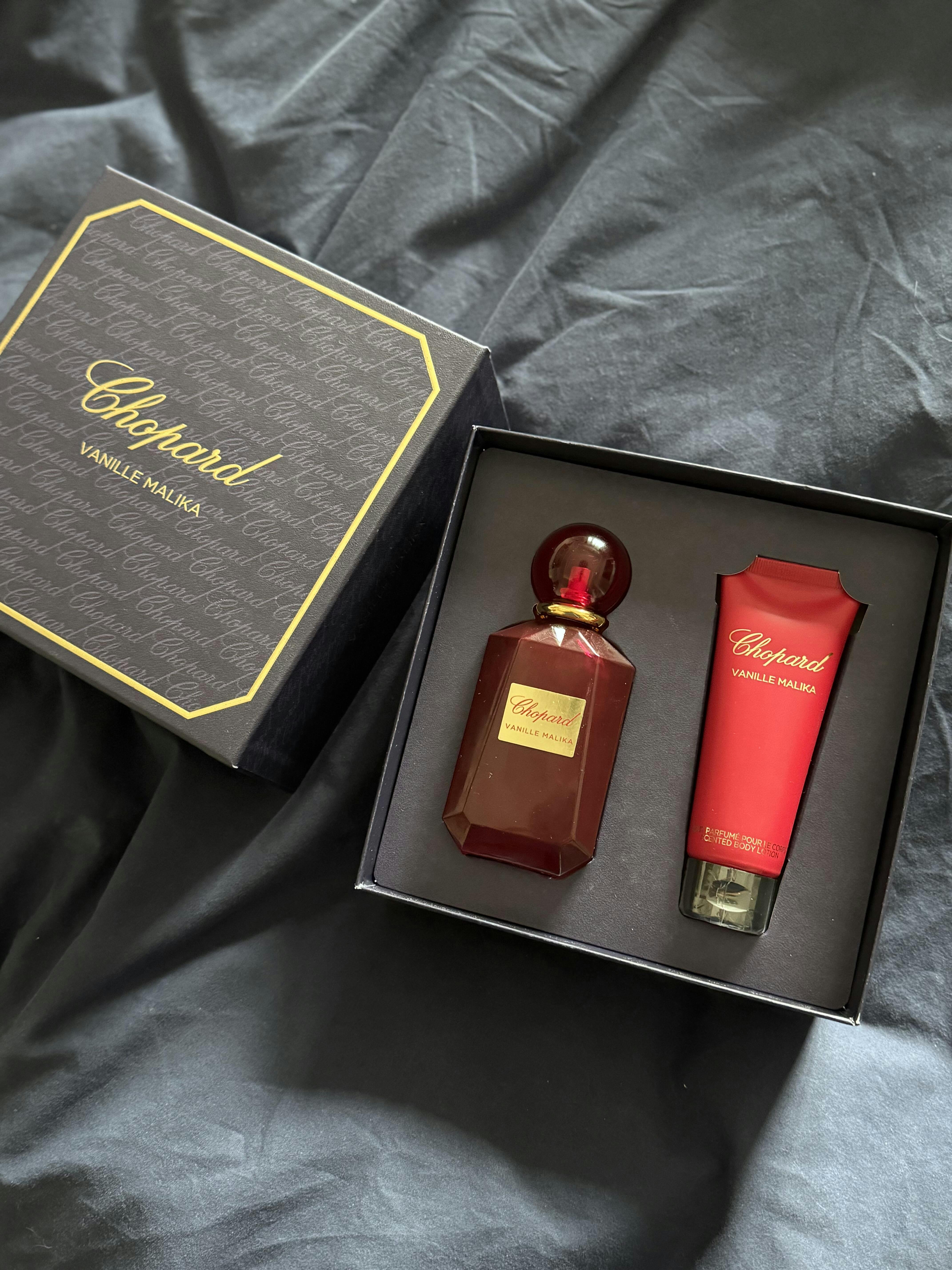 Indulge in the luxurious allure of Chopard Imperiale Vanille Malika with this exquisite gift set. The 100ml Eau de Parfum captures an enchanting blend of vanilla and exotic florals, delivering a sophisticated fragrance that lingers beautifully throughout your day. Complemented by the 75ml scented body lotion, this pairing nourishes your skin while extending the fragrance's captivating essence. Perfect for those who appreciate refined elegance, this curated collection makes an unforgettable gift for the discerning woman who deserves luxury.